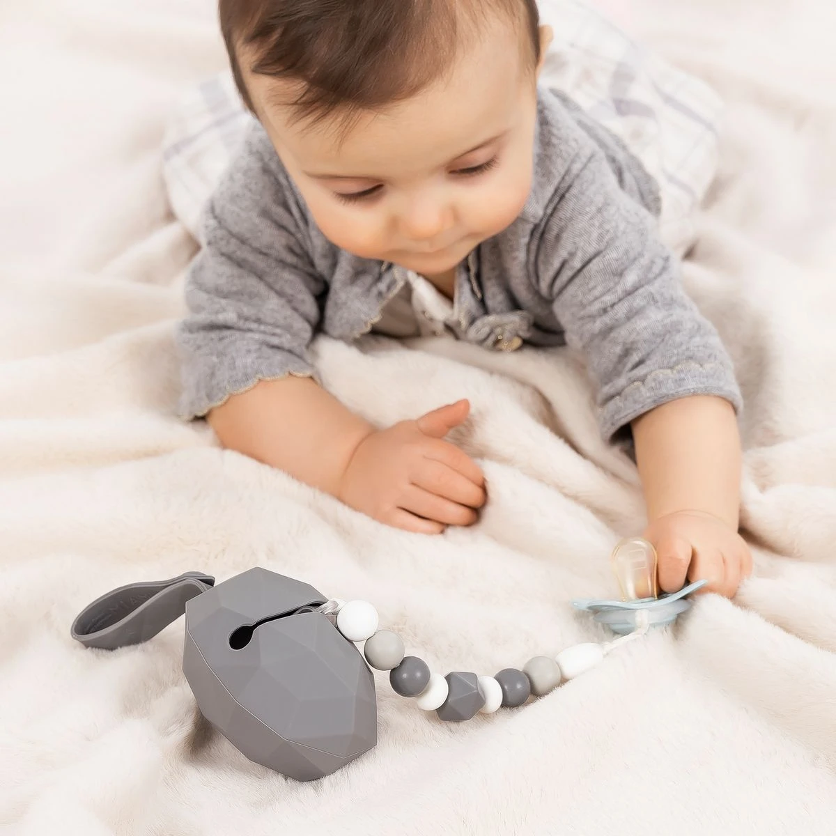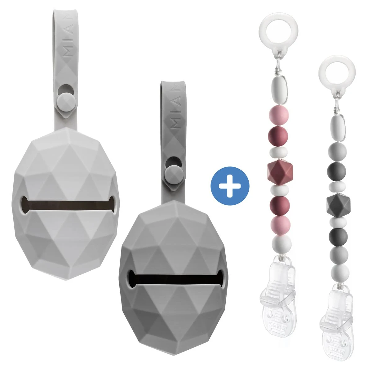 2 MiaMia Silikon-Schnullerbox / Schnullerhalter 2er Pack – Diamant – Grau Hellgrau