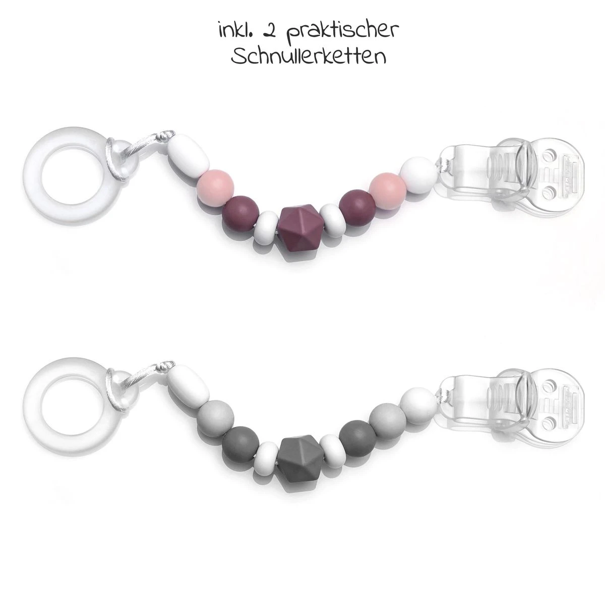 Bei einem Spaziergang, auf einem Ausflug, auf Reisen oder Zuhause: Der Lieblingsschnuller fällt unbemerkt herunter und geht leicht verloren. Damit Dein Schatz seinen Schnuller nicht verlieren kann und er nicht auf den Boden fällt, sichert ihn die MiaMia Schnullerkette im praktischen 2er Pack in Grau und Beere zuverlässig. Dabei ist sie für alle gängigen Schnuller-Marken passend und lässt sich für Schnuller mit und ohne Greifring verwenden.