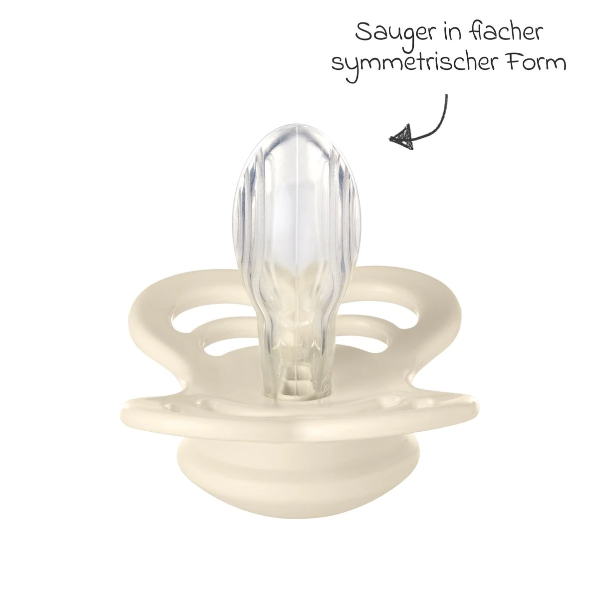 Durch den symmetrischen Sauger aus Silikon besteht der Schnuller aus einem besonders langlebigen und extrem widerstandsfähigem Material. Im Unterschied zu Latex dehnt sich Silikon nicht aus und behält die Form bei.