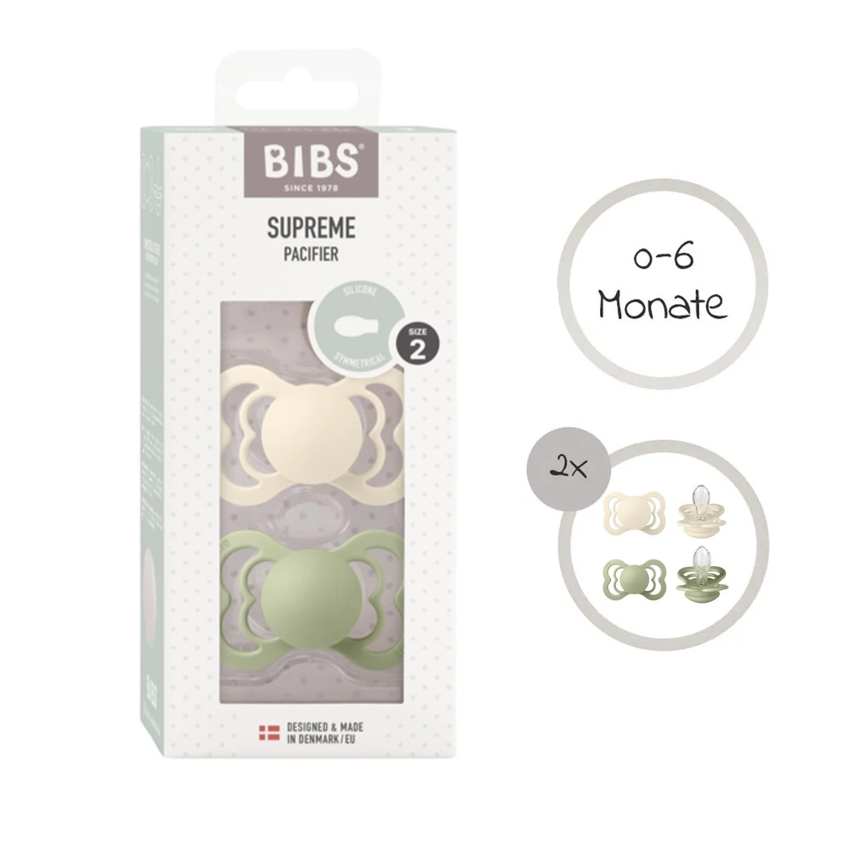 Das 2-teilige Schnuller-Set – Supreme – Gr. 0-6 M von BIBS besteht aus reinem Silikon – frei von BPA, PVC & Phthalaten. Das samtweiche, langlebige und hautschonende Material vermittelt Deinem kleinen Spatz ein natürliches Sauggefühl. Durch die flache, symmetrische Form und das runde Schild ahmt der Schnuller die Form der Mutterbrust auf natürliche Weise nach und reduziert den Druck auf den Zähnen, sowie dem Kiefer.