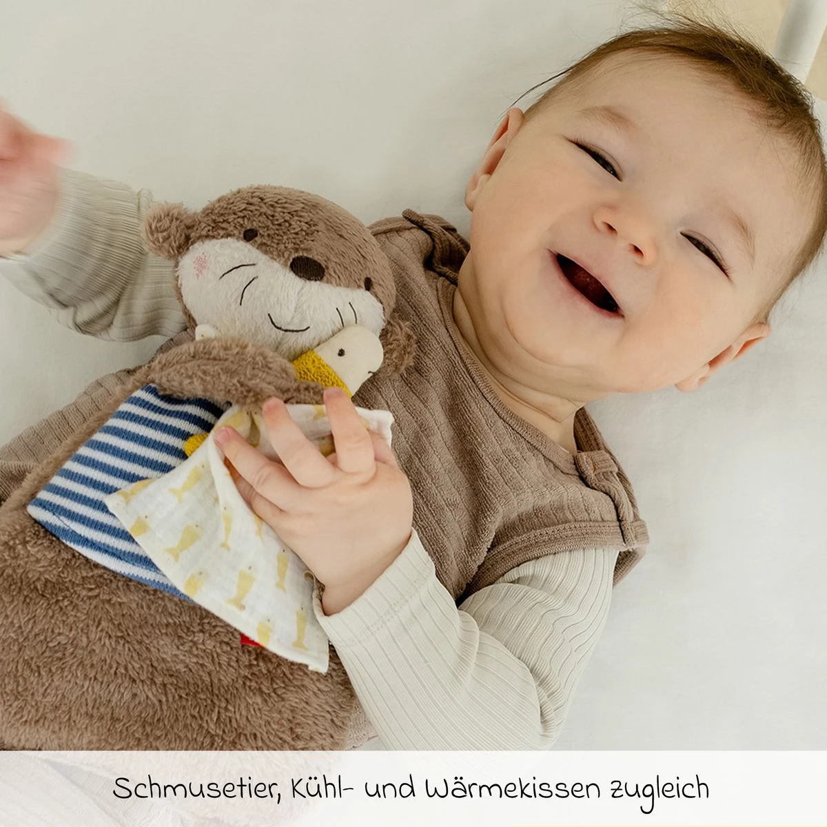 Das Kissen gibt die Wärme oder Kälte gleichmäßig und wohltuend ab. Der niedliche Otter tröstet die Kleinsten im Bettchen, in der Babyschale oder im Kinderwagen. Mit bezaubernden Details regt es außerdem zum Fühlen und Greifen an.