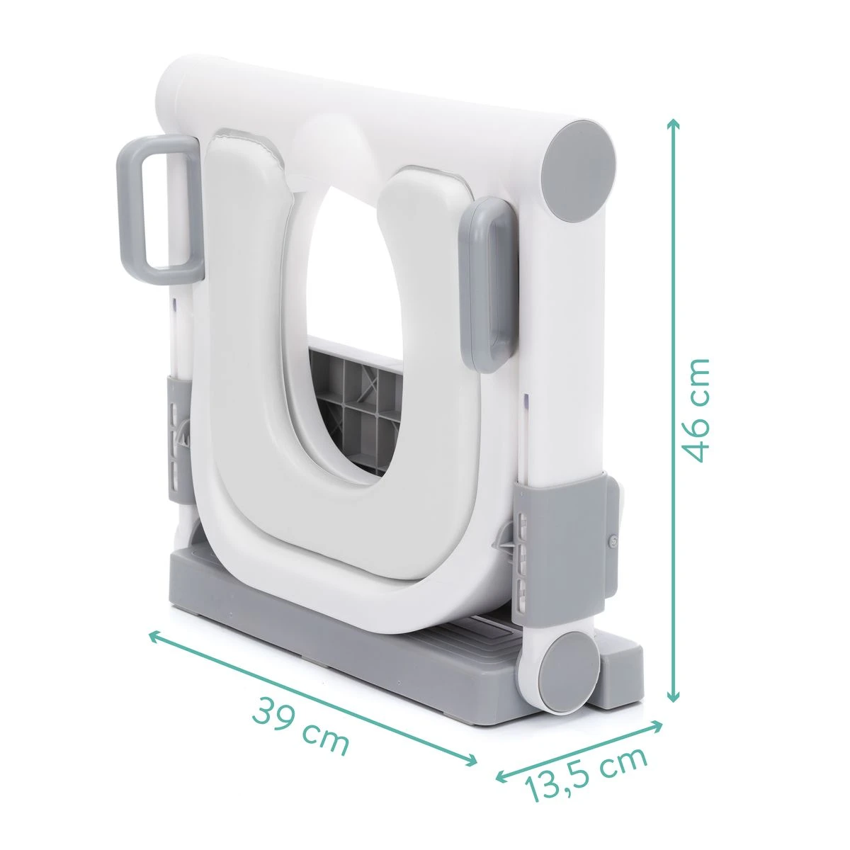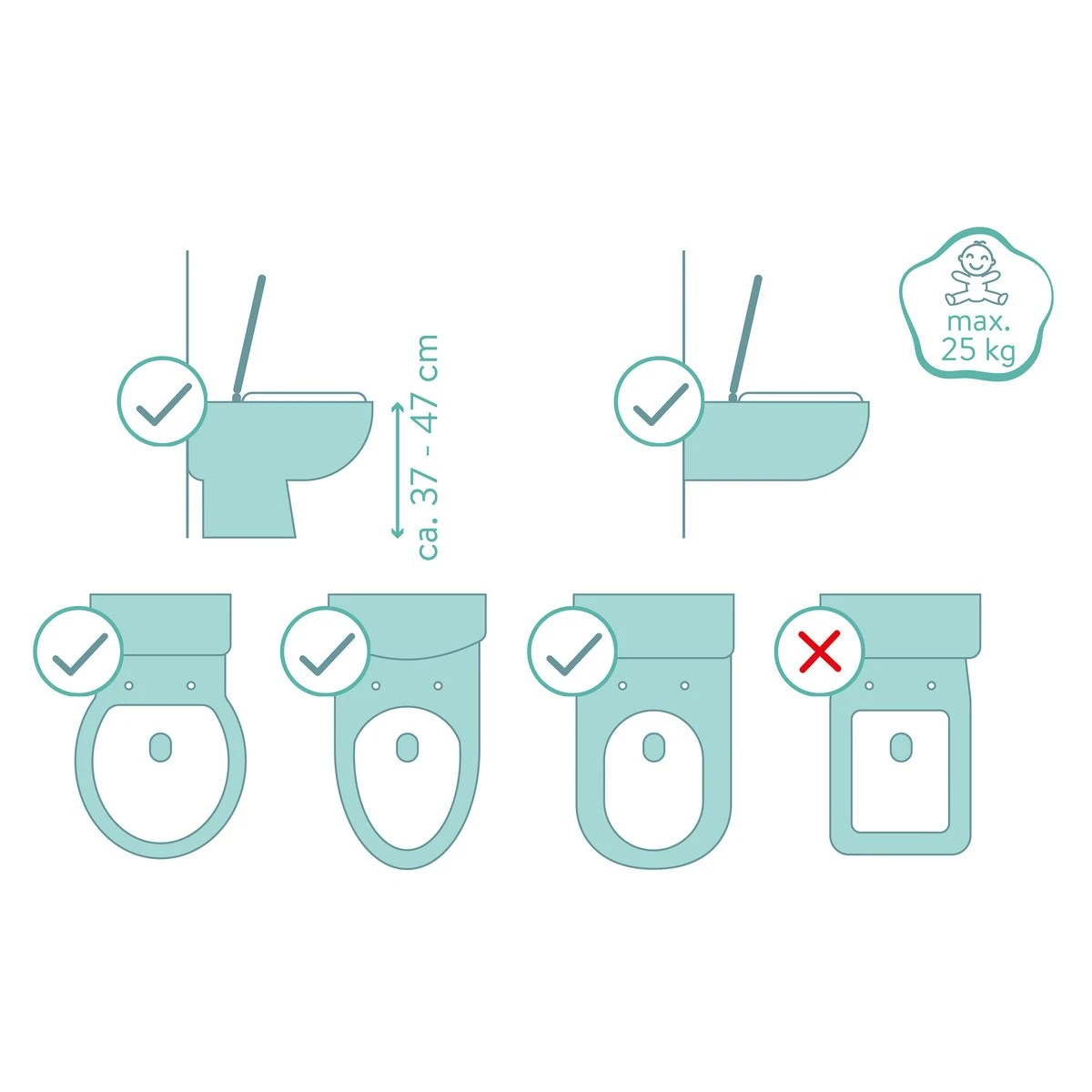Der Toilettentrainer ist flexibel einsetzbar und passt perfekt auf Toilettenhöhen von 37 bis 41 cm. Mit seinem durchdachten Design macht er die ersten Schritte zur Toilettennutzung für Dein Kind sicher, bequem und stressfrei.