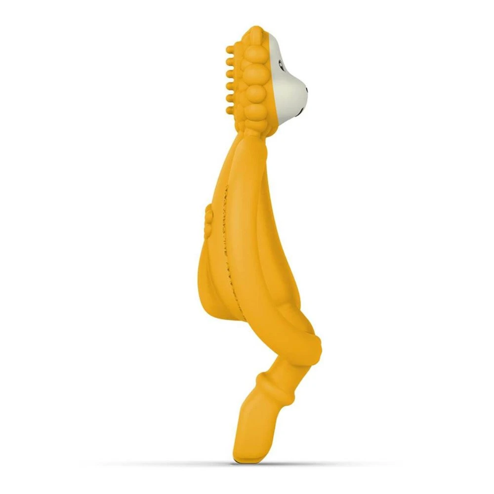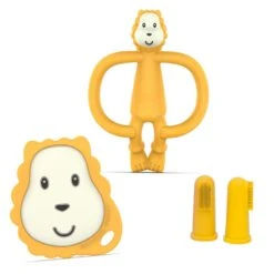 Wenn sich die ersten Zähnchen anbahnen, ist das Beiß-Bedürfnis zur Schmerzlinderung bei den Kleinsten sehr groß. Sind dann auch schon die ersten Milchzähne da, müssen sie regelmäßig gepflegt werden. In dieser Zeit ist das 4-tlg. Starter-Set Zahnungshilfen – Beißring mit Fingerzahnbürste – Löwe in Gelb von Matchstick Monkey die perfekte Ausstattung ab 3 Monaten: Das BPA-freie, weiche Silikon in Lebensmittelqualität bietet sich zum Beißen an, massiert dabei das schmerzende Zahnfleisch und reinigt die kleinen Beißerchen sehr schonend.