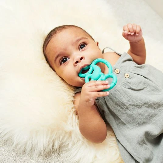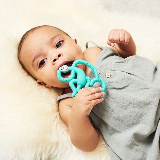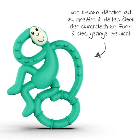 Wenn sich die ersten Zähnchen anbahnen, ist das Beiß-Bedürfnis zur Schmerzlinderung bei den Kleinsten sehr groß. In der Zahnungsphase ist der Matchstick Monkey Beißring Mini – Affe in Grün ab 3 Monaten ein willkommener Helfer für Dein Baby: Das BPA-freie, weiche Silikon in Lebensmittelqualität bietet sich zum Beißen an und massiert dabei das schmerzende Zahnfleisch.