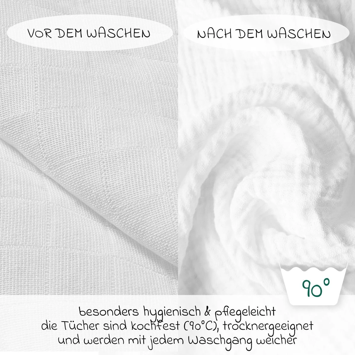 Zur hygienischen Reinigung kannst Du die Windeln einfach bis 90° C in der Waschmaschine reinigen und bei niedrigen Temperaturen im Trockner trocknen. Die Mullwindeln können auf Stufe zwei (bis 150° C) gebügelt werden.