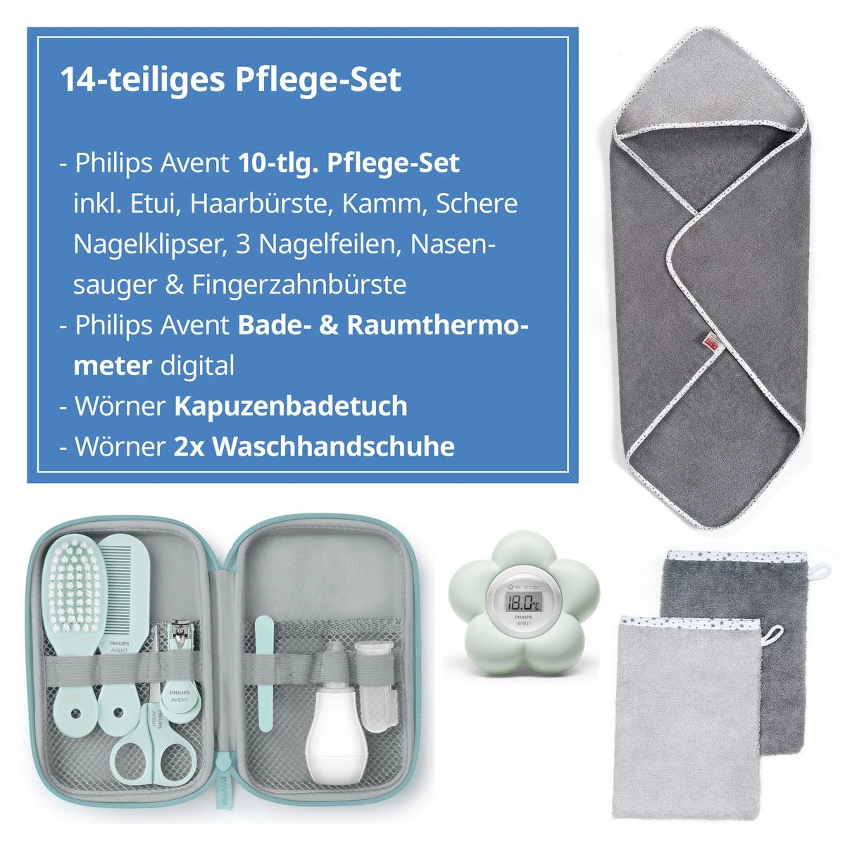 1 Bad-& Raumthermometer inkl. Batterien3 Mini-Nagelfeilen 1 Nagelknipser 1 Nasensauger 1 Nagelschere 1 Fingerzahnbürste 1 Mini-Kamm1 Babybürste 1 Aufbewahrungstasche2 Waschhandschuhe 1 Kapuzenbadetuch