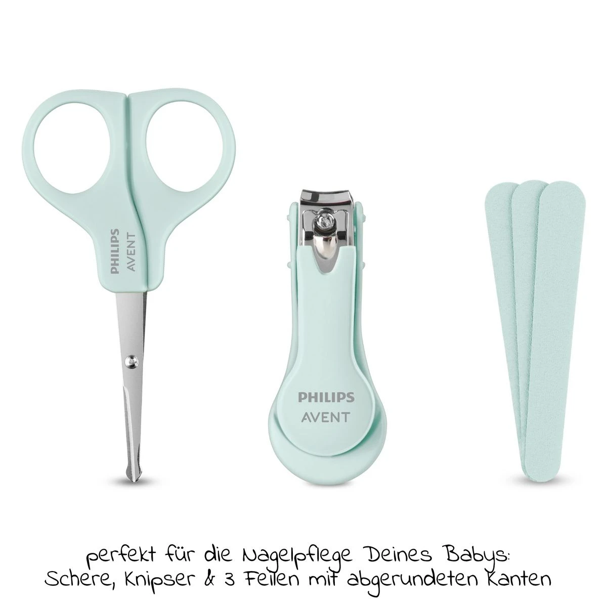 Mein erstes Pflegeset von Philips AVENT beinhaltet alles Wichtige für die Pflege Deines Babys. Das 10-teilige Set besteht aus einer weichen Babybürste, dem passendem Mini-Kamm, einer Nagelschere mit abgerundeten Spitzen, einem Nagelknipser und drei Mini-Nagelfeilen. Außerdem sind ein Nasensauger und eine Fingerzahnbürste mit dabei. Verpackt ist alles in einer sehr hochwertigen und funktionalen Aufbewahrungstasche. So hast Du die Sachen immer gut verstaut und griffbereit. Außerdem ist das Mäppchen Pflegeset ideal für unterwegs.