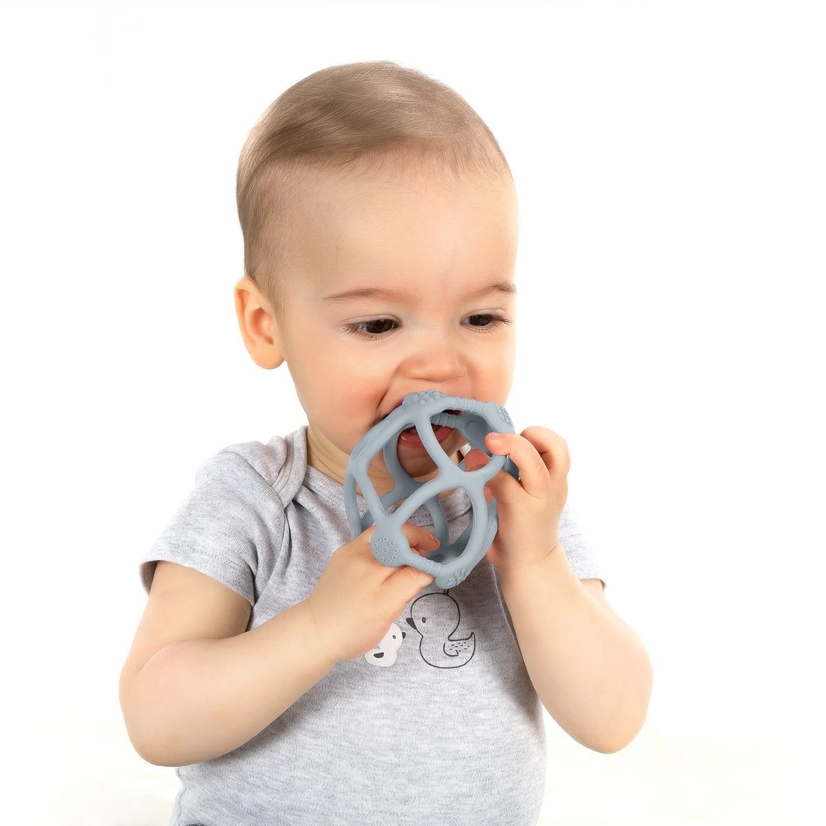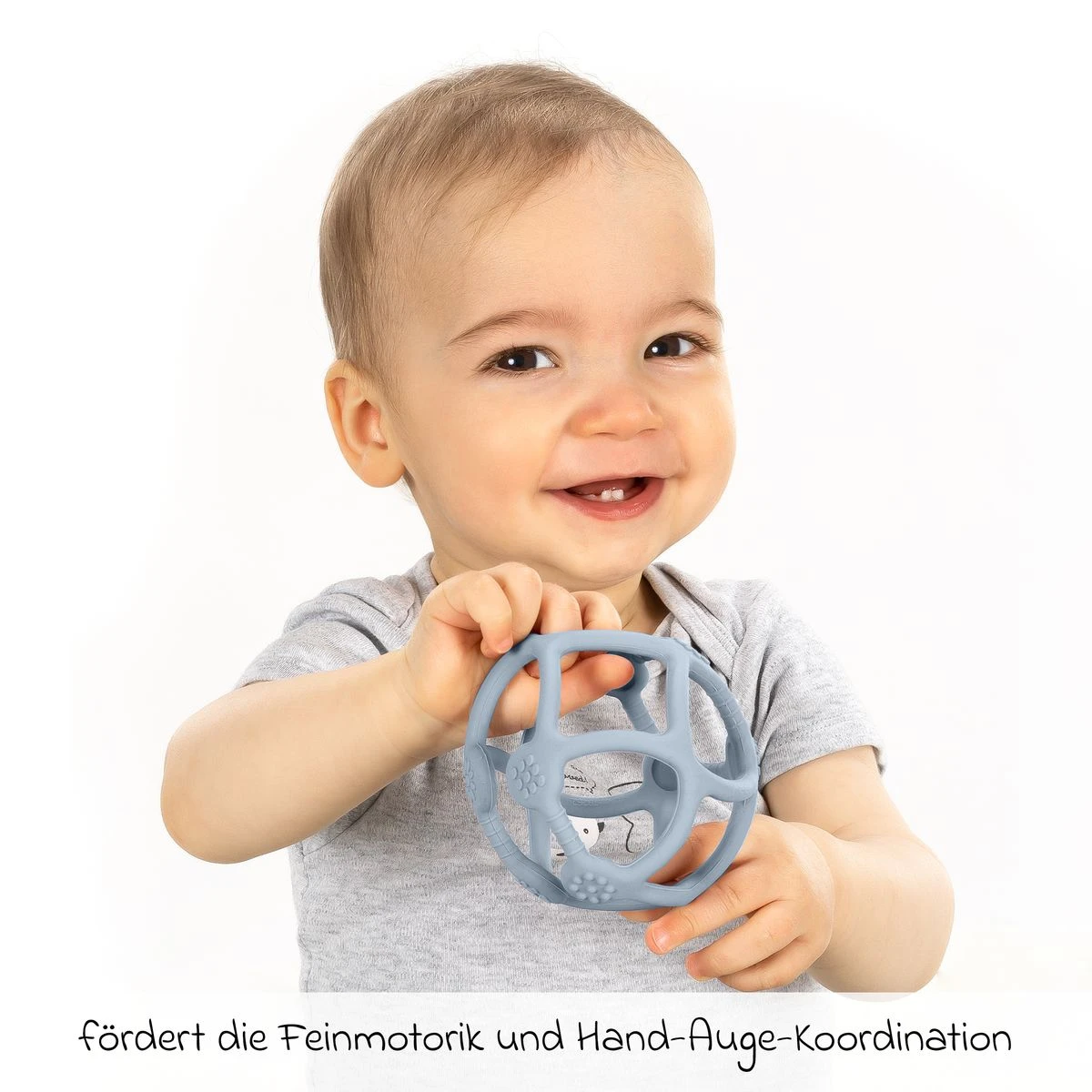 Schmerzendes Zahnfleisch lässt sich durch leichtes Kauen wohltuend massieren. Anstatt auf den eigenen Fingerchen herumzukauen, kannst Du Deinem Kind den Beißball als ideales Hilfsmittel zur Schmerzlinderung bieten. Mit seinen unterschiedlichen Strukturen sorgt er für einen beruhigenden Massageeffekt und ein abwechslungsreiches Beißgefühl.