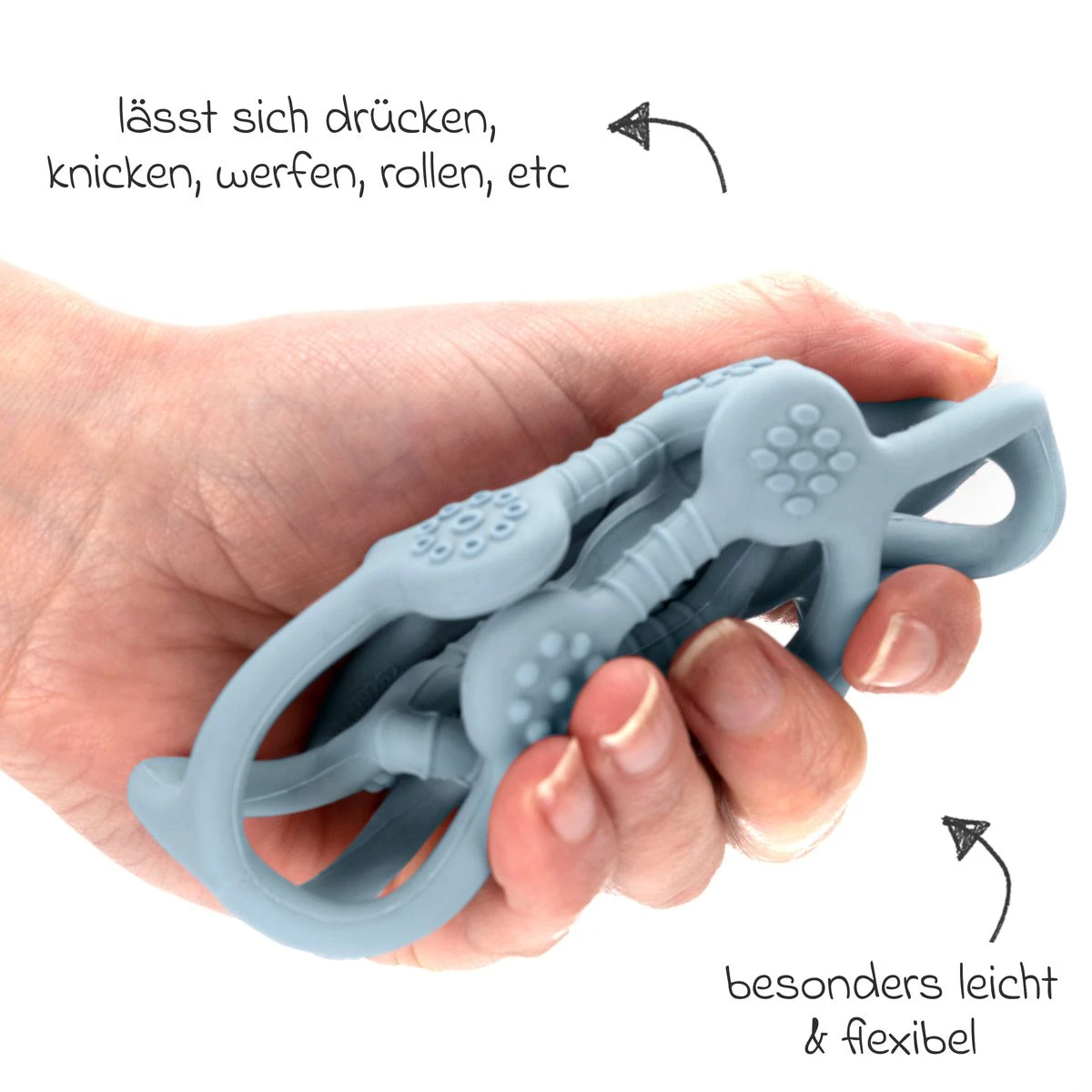 Für einen unbedenklichen und langlebigen Einsatz wurde das Bite&Play aus strapazierfähigem Silikon gefertigt – zu 100% frei von gefährlichen Schadstoffen wie BPA, PVC oder Phthalaten. Das weiche und flexible Material lässt sich drücken, knicken und komplett verformen ohne dabei kaputt zu gehen. Dennoch ist es so robust, dass es selbst häufiges Kauen unbeschadet übersteht.