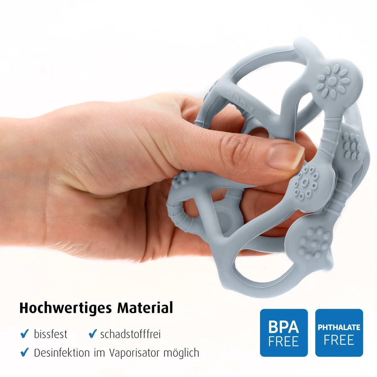 Nach der Nutzung lässt sich der Beißball schnell und einfach unter warmem fließenden Wasser reinigen. Für eine besonders hygienische Reinigung kann der Beißring anschließend abgekocht oder im Vaporisator dampfsterilisiert werden.