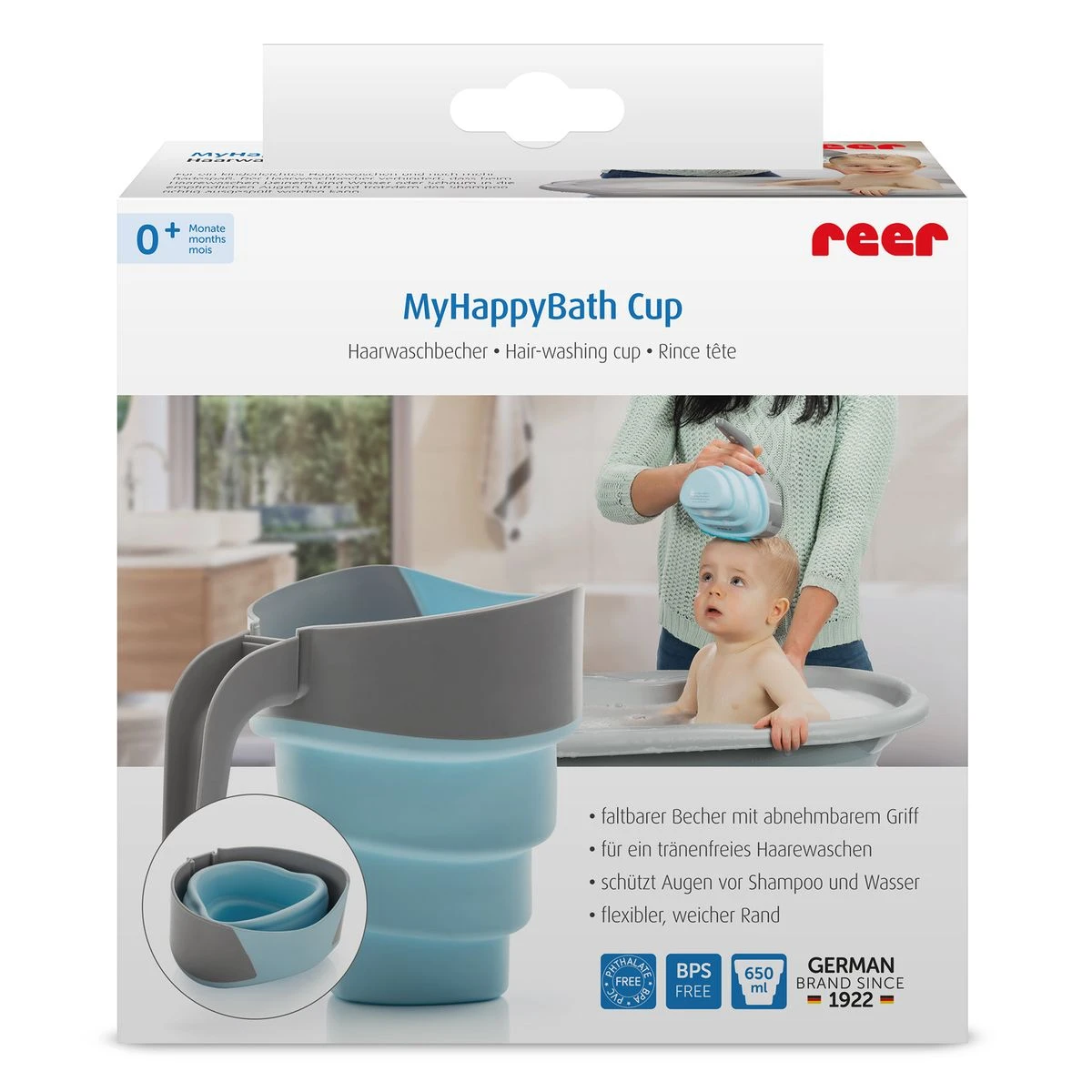 Der Becher ist klein zusammenfaltbar und der Griff abnehmbar, daher ist der Becher auch ideal zum mitnehmen und garantiert eine platzsparende Aufbewahrung. Dank einem Füllvolumen von 650 ml lassen sich die Haare schnell ausspülen. Der abnehmbare Griff des Bechers liegt dabei sehr angenehm in Deiner Hand. Wird der Haarwasch-Becher gerade nicht zum Ausspülen gebraucht, kann er auch als Spielzeug während dem Babybad dienen.