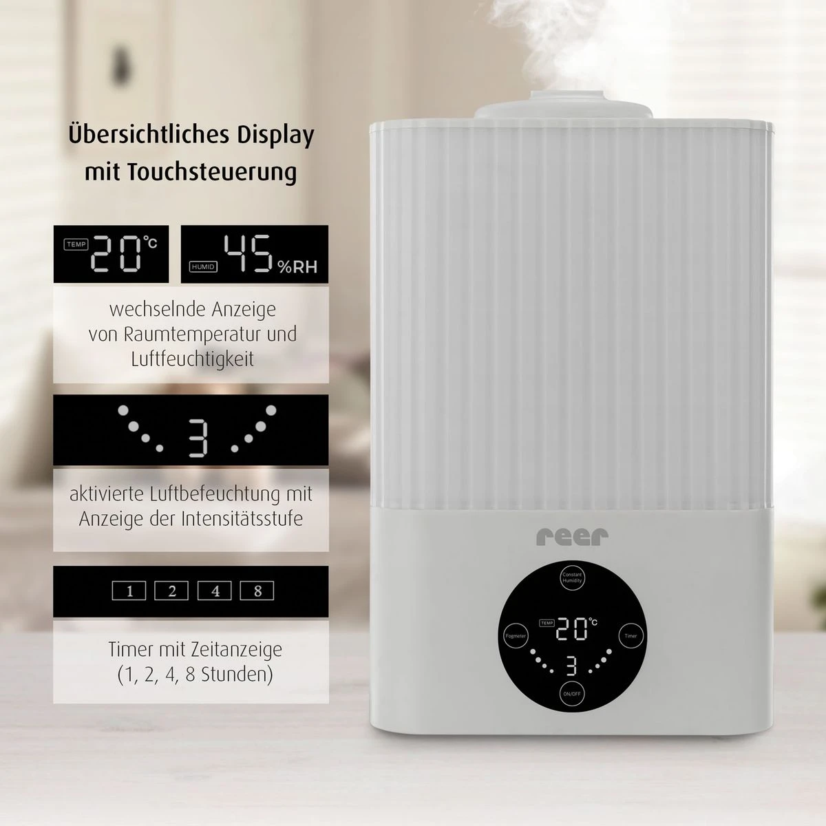 Die Bedienung des Luftbefeuchters ist kinderleicht durch das intuitiv bedienbare LCD-Touch-Display und IR-Fernbedienung. Die Temperatur- und Luftfeuchtigkeitsanzeige kann durch das Display genau kontrolliert und reguliert werden.