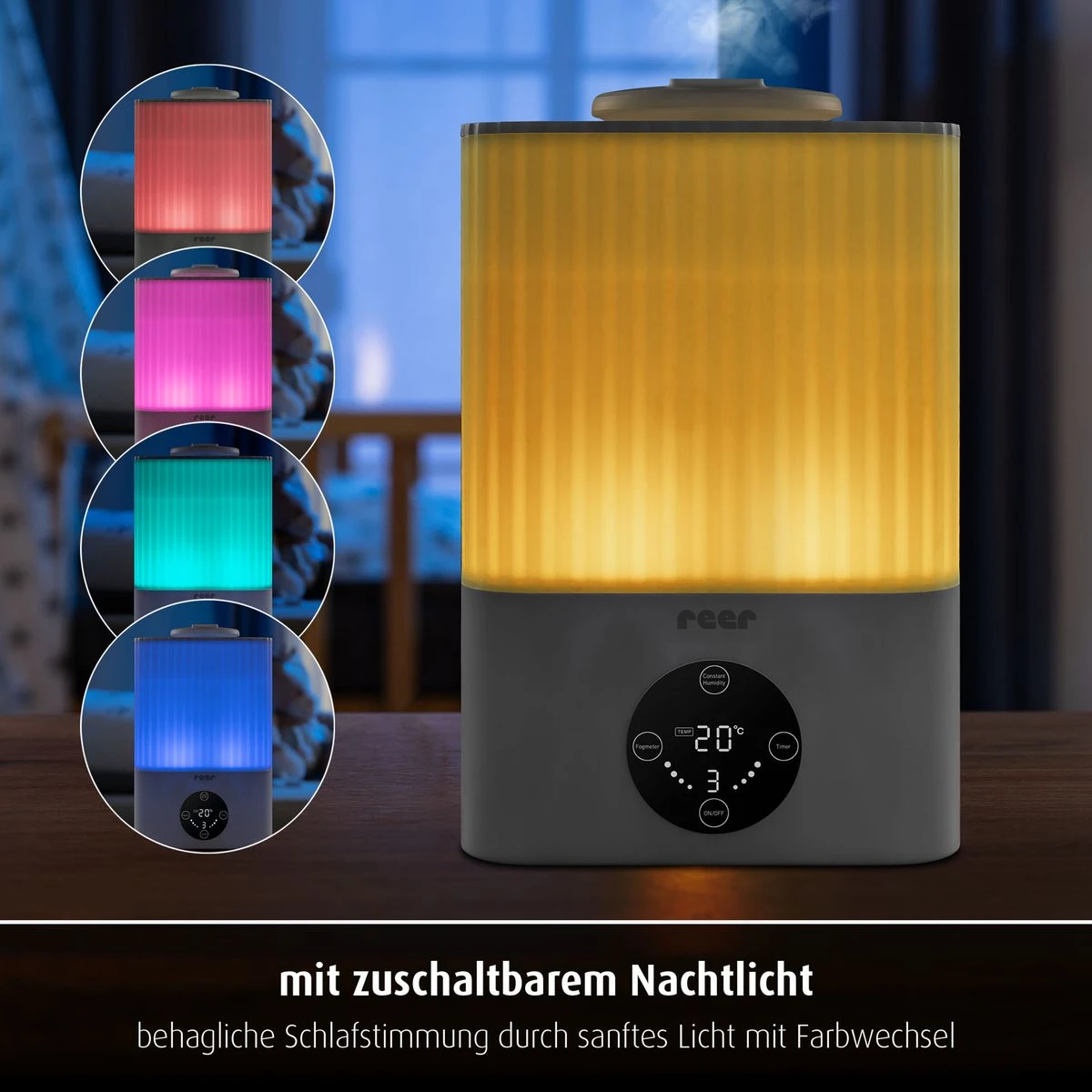 Das Nachtlicht mit sanftem Farbwechsel kann ganz nach Bedarf ein- oder ausgeschaltet werden. Der zuschaltbare Timer ist in einem Intervall von 1 / 2 / 4 / 8 Stunden einstellbar. Somit läuft Dein Luftbefeuchter nur solange wie Du es möchtest. Auch Dauerbetrieb ist möglich.