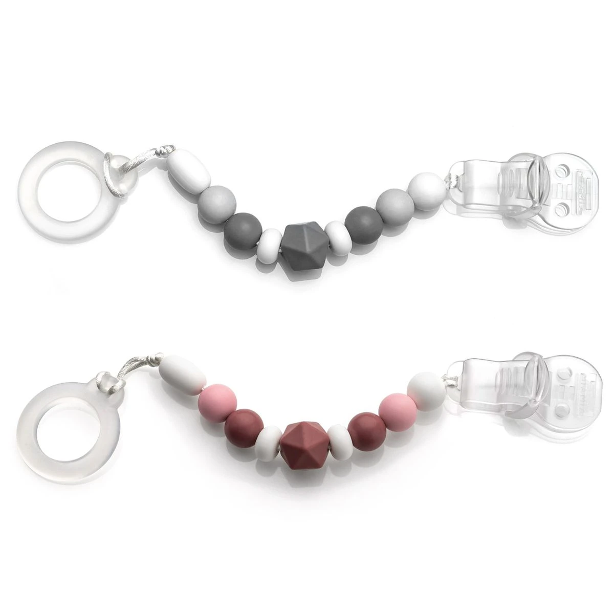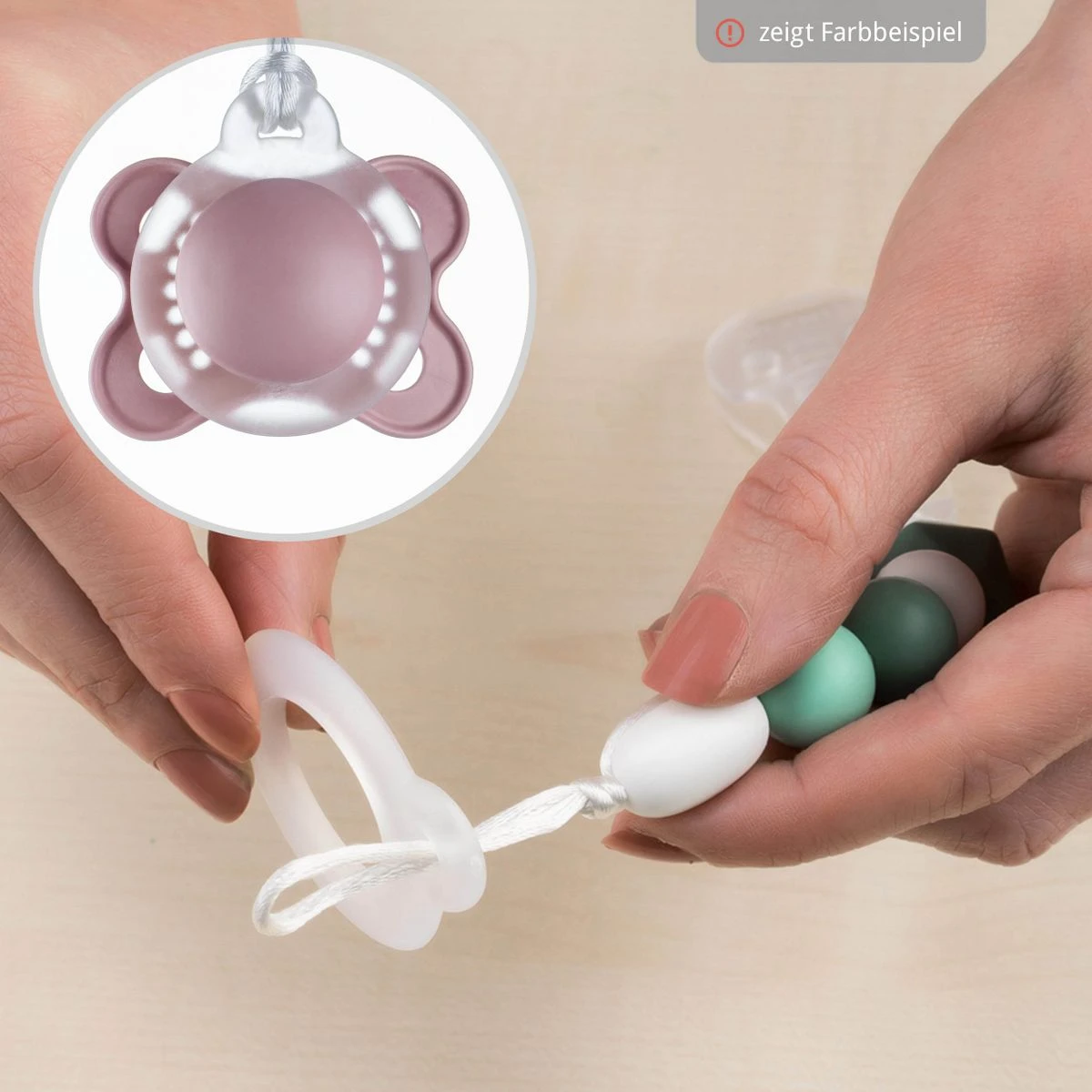 - Material: Perlen aus lebensmittelechtem Silikon (LFGB), Befestigungsring aus EVA, Clip aus PCTG, Schnur aus Polyester