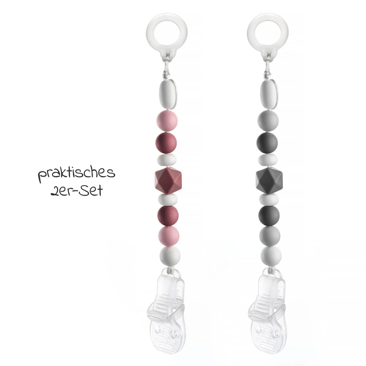 2 MiaMia Schnullerketten in Grau & Beere