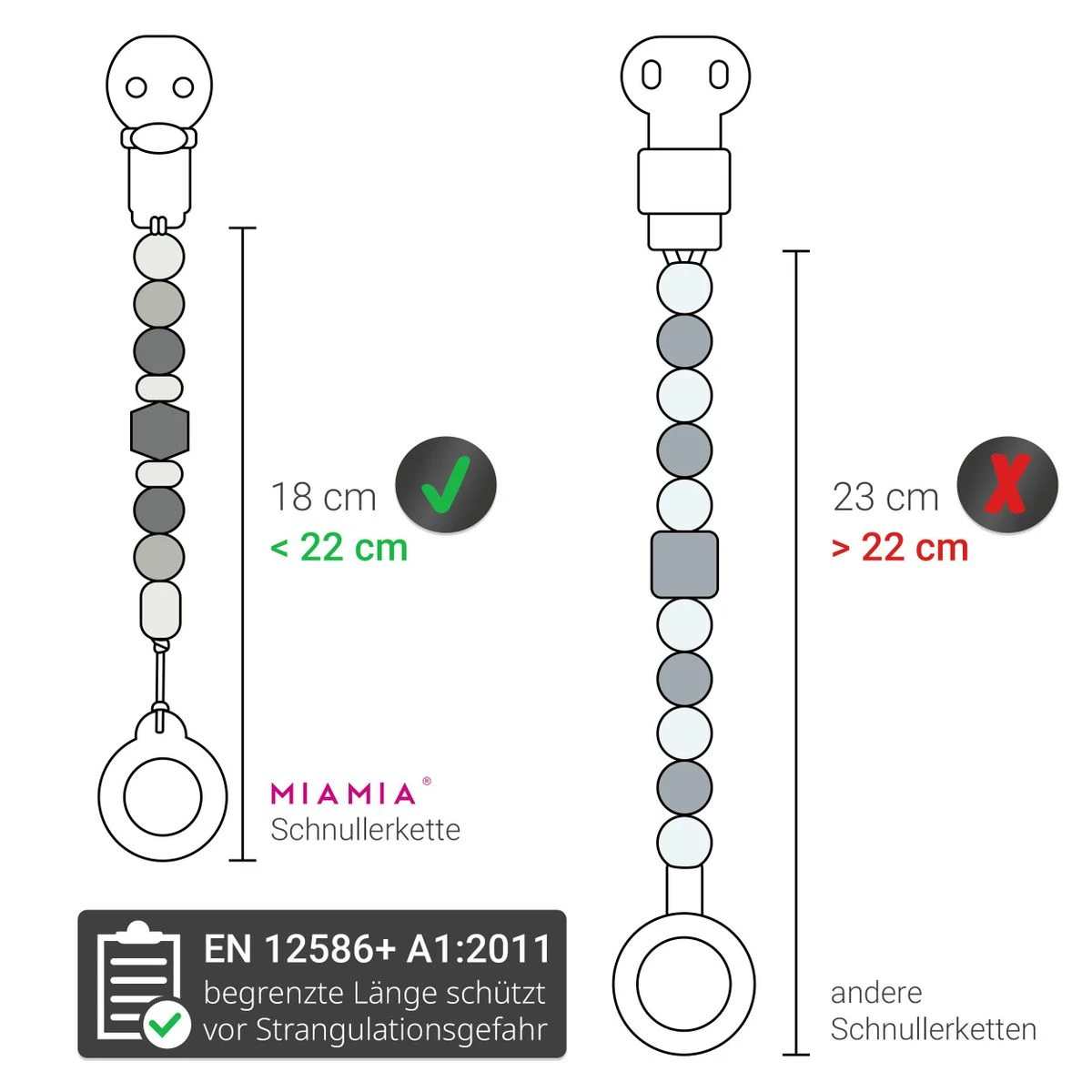 Bei einem Spaziergang, auf einem Ausflug, auf Reisen oder Zuhause: Der Lieblingsschnuller fällt unbemerkt herunter und geht leicht verloren. Damit Dein Schatz seinen Schnuller nicht verlieren kann und er nicht auf den Boden fällt, sichert ihn die MiaMia Schnullerkette im praktischen 2er Pack in Grau und Beere zuverlässig. Dabei ist sie für alle gängigen Schnuller-Marken passend und lässt sich für Schnuller mit und ohne Greifring verwenden.